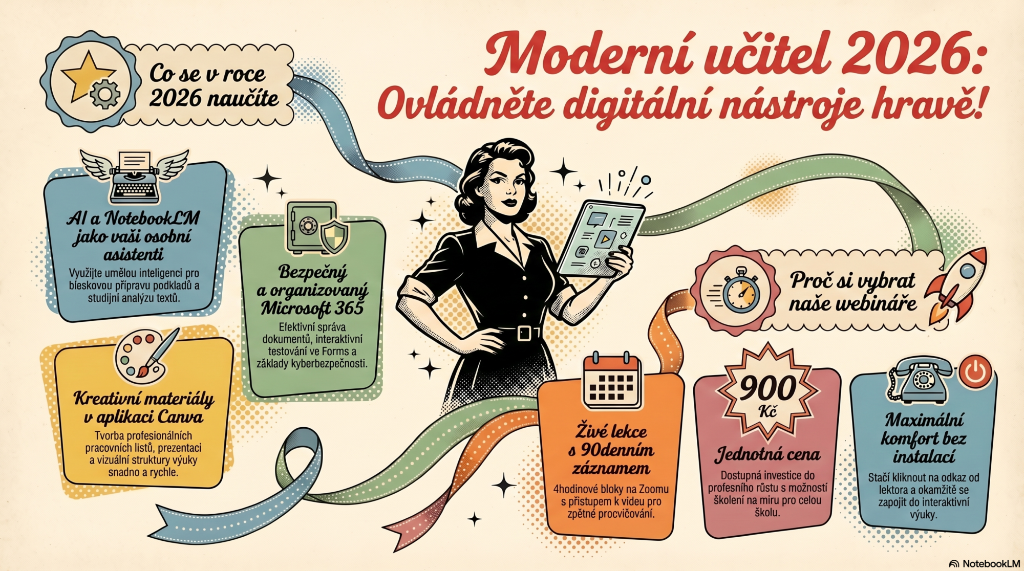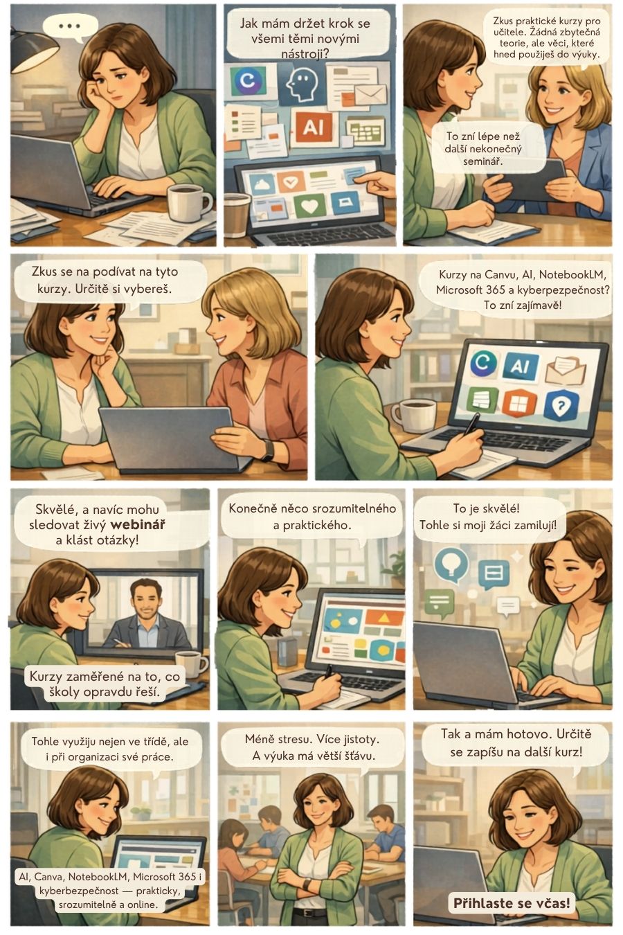 Hledáte praktický kurz pro pedagogy, který vám pomůže zefektivnit výuku, přípravu materiálů nebo práci s digitálními nástroji? Aktuálně jsou vypsané online termíny DVPP zaměřené na AI, Canvu, NotebookLM, kyberbezpečnost i Microsoft 365. Webináře probíhají živě v aplikaci Zoom, standardně v rozsahu 4 hodin, a účastníci mají navíc přístup k záznamu po dobu 90 dnů.